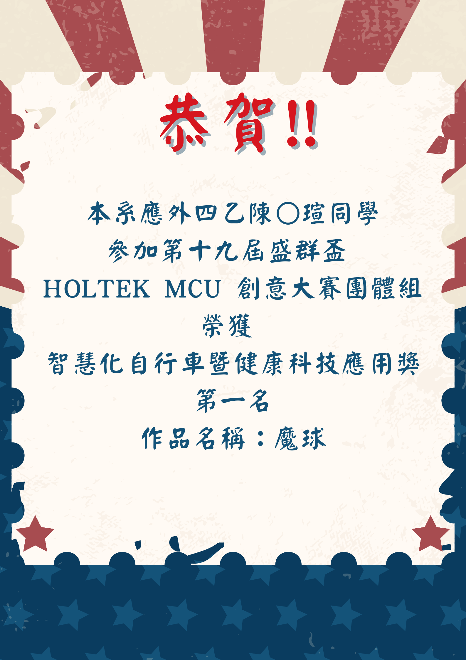 [系上公告]恭賀!應外四乙陳O瑄同學參加第十九屆盛群盃HOLTEK MCU創意大賽團體組榮獲智慧控制應用組第一名