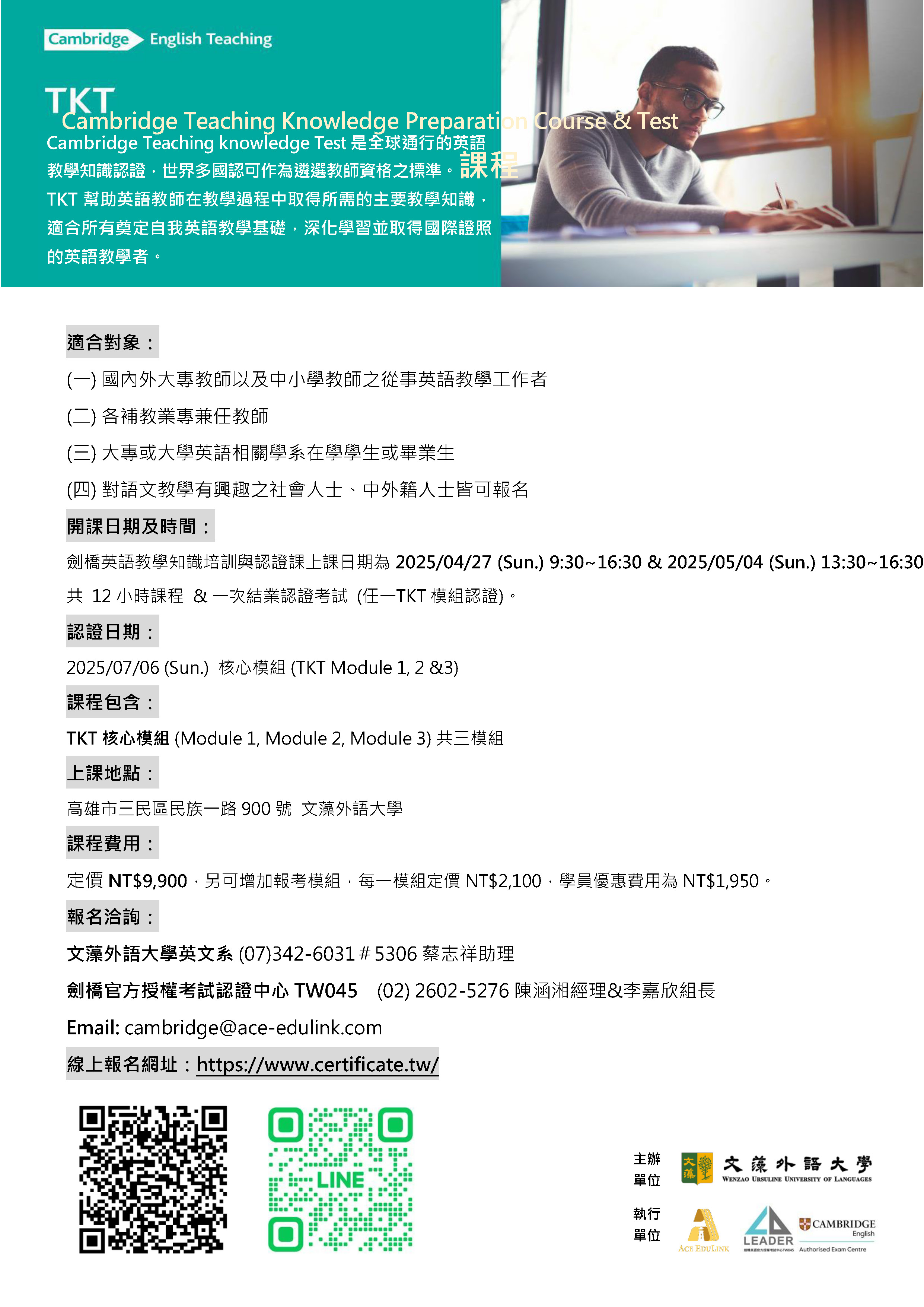文藻外语大学 英国语文系 开办「Cambridge English 国际教师 教学专业证照暨国际英语师资班」
