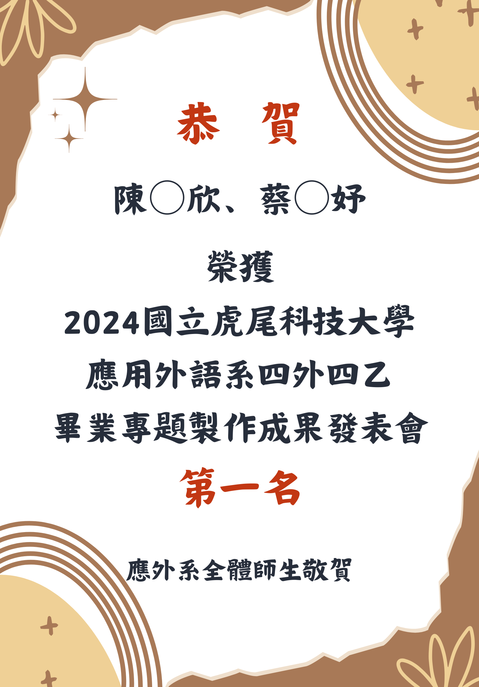 [系上公告]恭喜!2024應外系畢業專題製作成果發表會四外乙陳○欣、蔡○妤榮獲第一名!