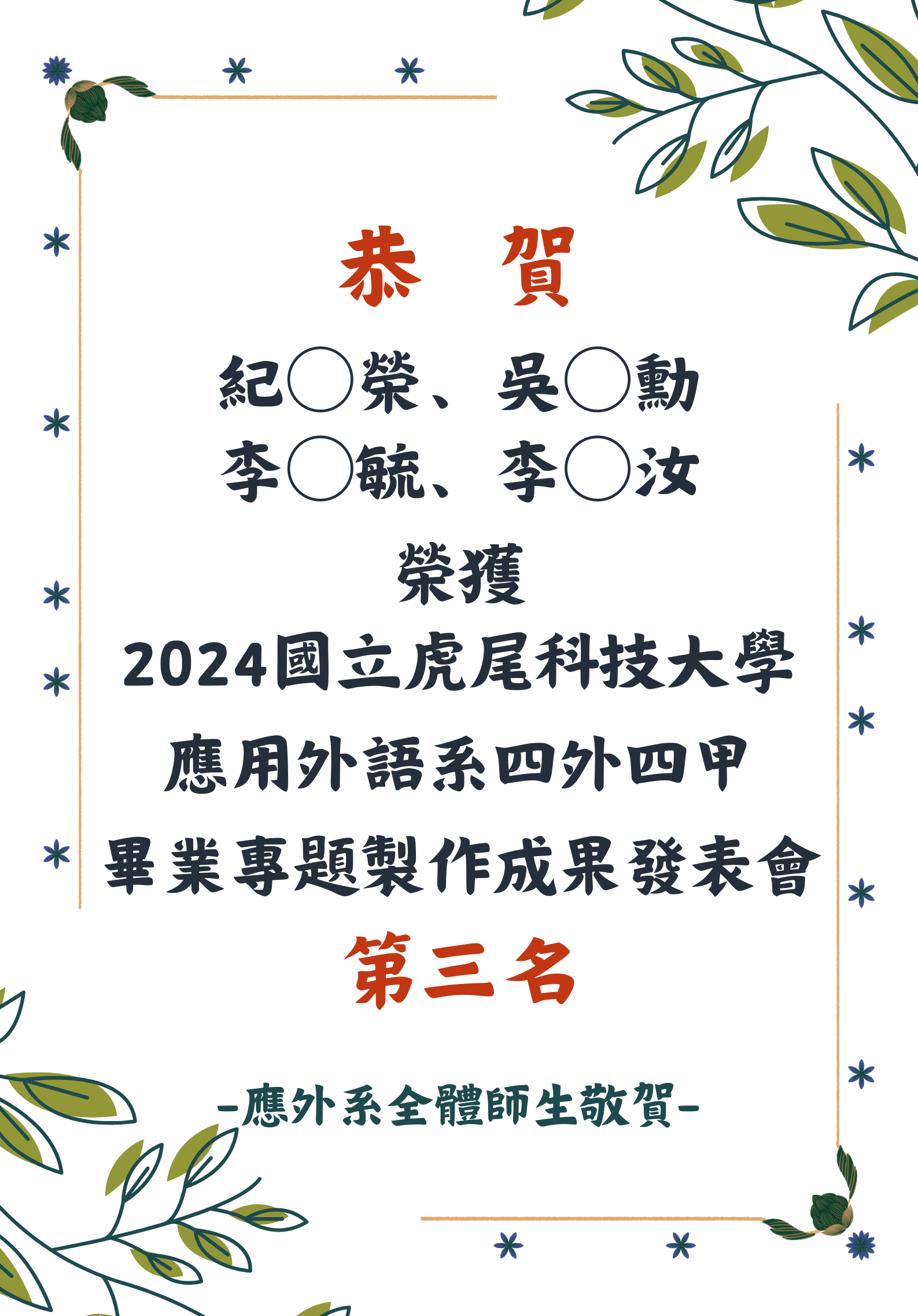 [系上公告]恭喜!2024應外系畢業專題製作成果發表會四外四甲紀○榮、吳○勳、李○毓、李○汝榮獲第三名!